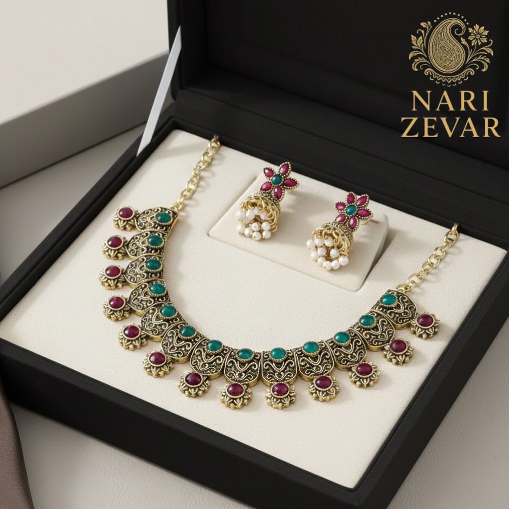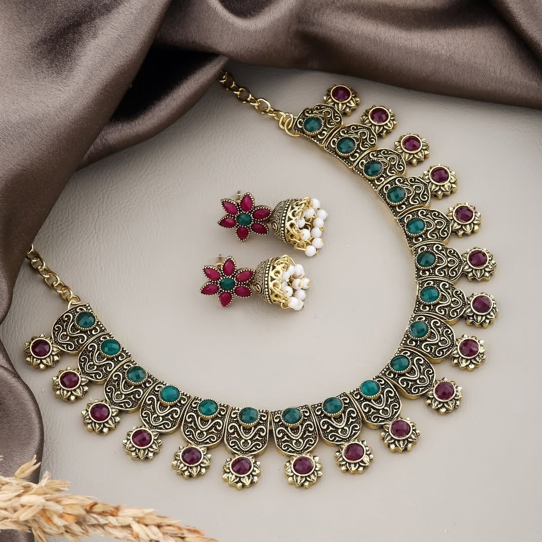 Classic antique tones with vibrant stones, crafted to elevate your festive and ethnic looks.